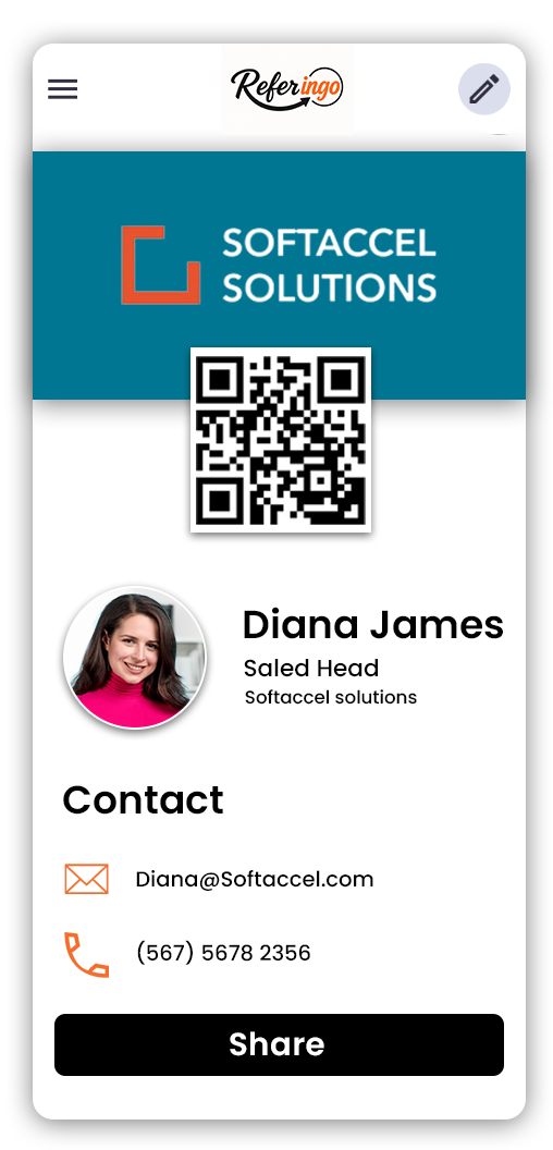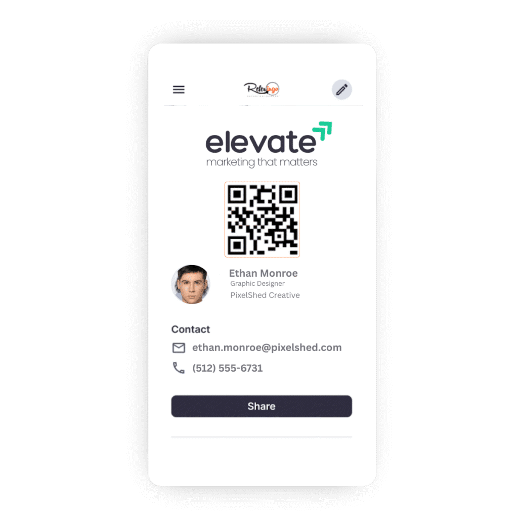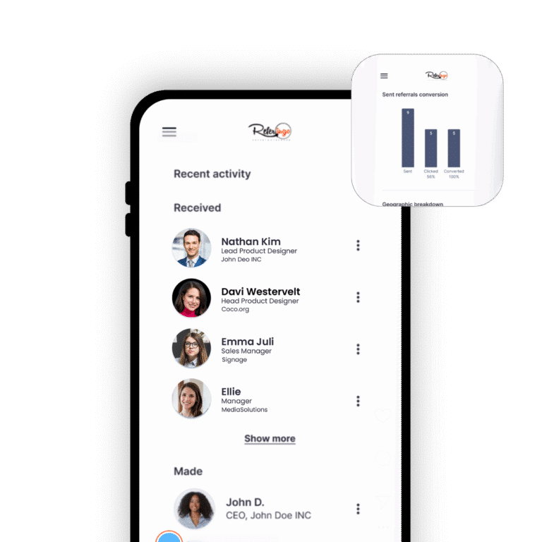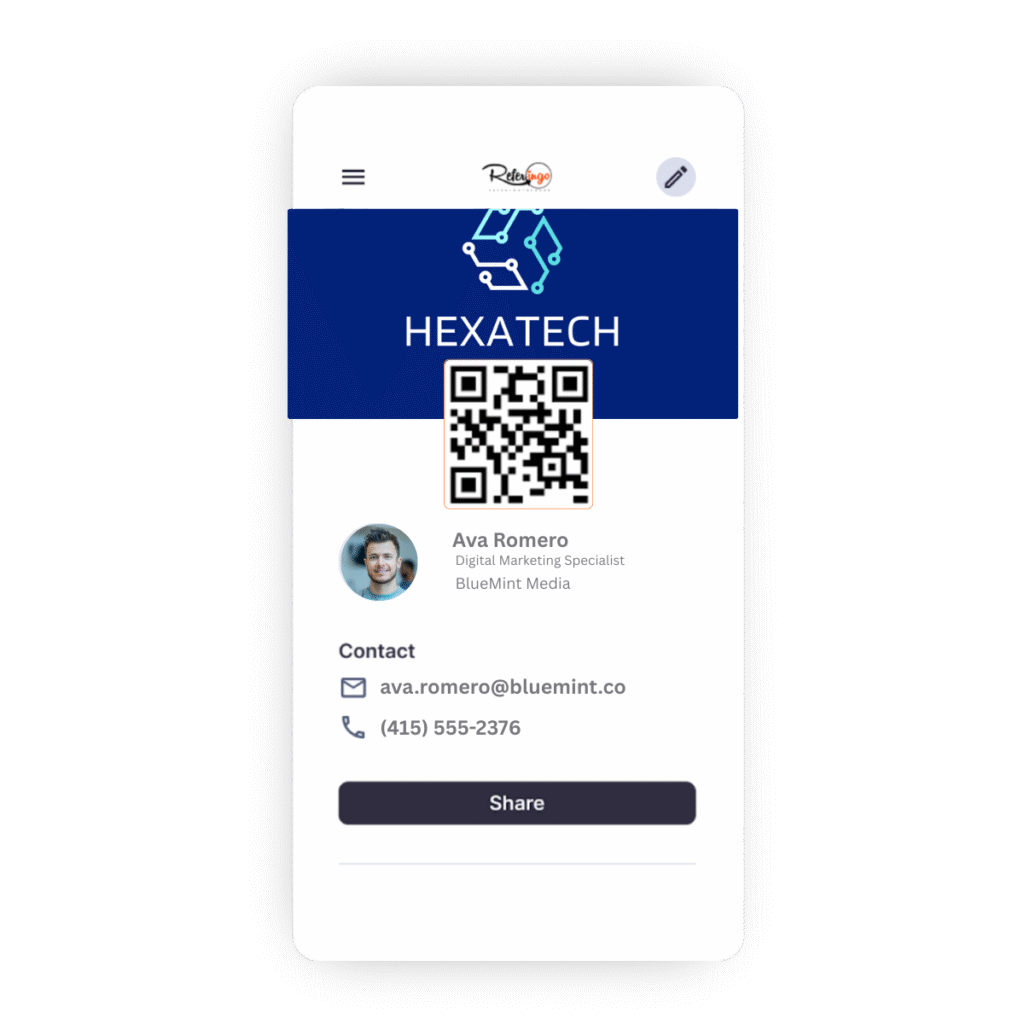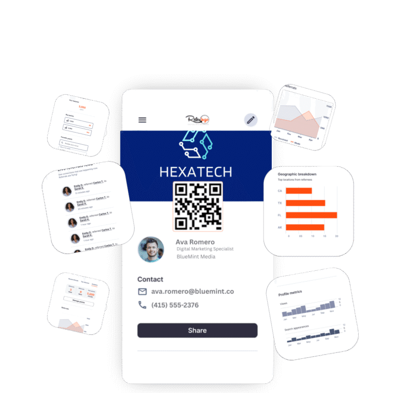 Easily personalize your referral card with videos, social media links, and program details. Whether you’re a freelancer, sales professional, or business owner, Referingo makes it simple to connect and grow your network with a compelling first impression.