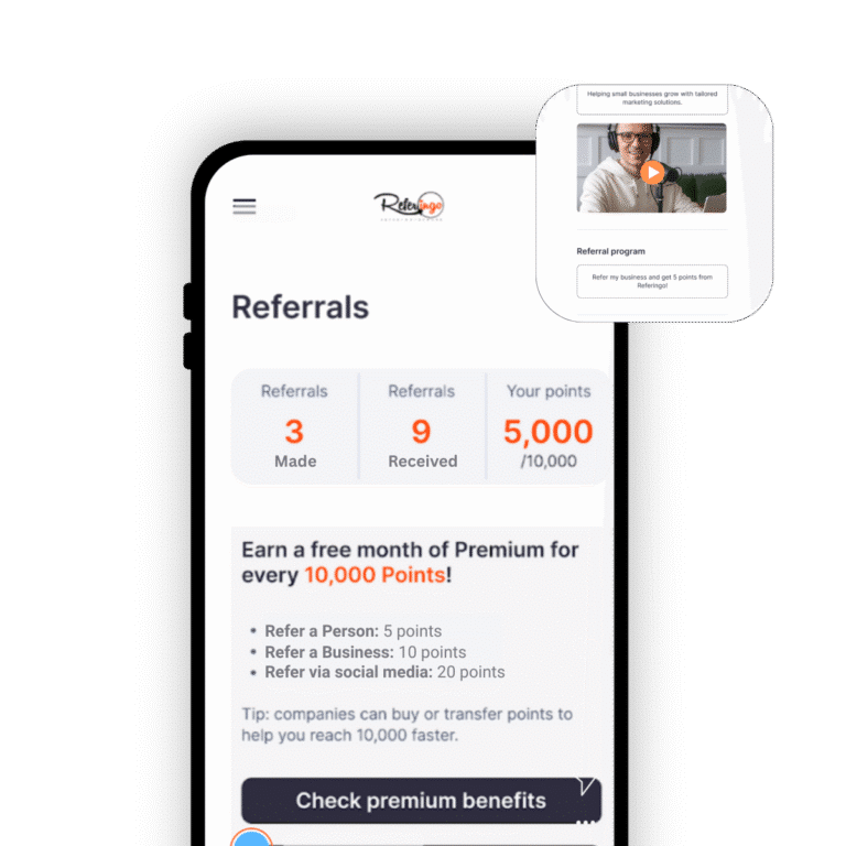 Referingo makes sharing rewarding. Every referral you make earns you points—whether it’s a person, a business, or via social platforms like Facebook. Redeem your points for exclusive benefits, including premium access. Your live points dashboard keeps you updated on how close you are to your next reward.